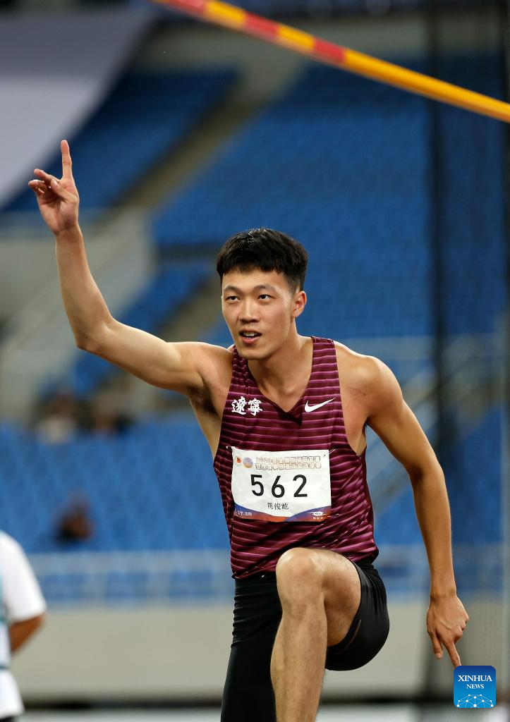 First-placed Yao Jie of Shanxi reacts during the men's pole vault final at the 2023 China's National Athletics Championships, a qualification trial for World Athletics Championships Budapest 23 and the Hangzhou Asian Games in Shenyang, northeast China's Liaoning Province, June 27, 2023. (Xinhua/Wang Lili)