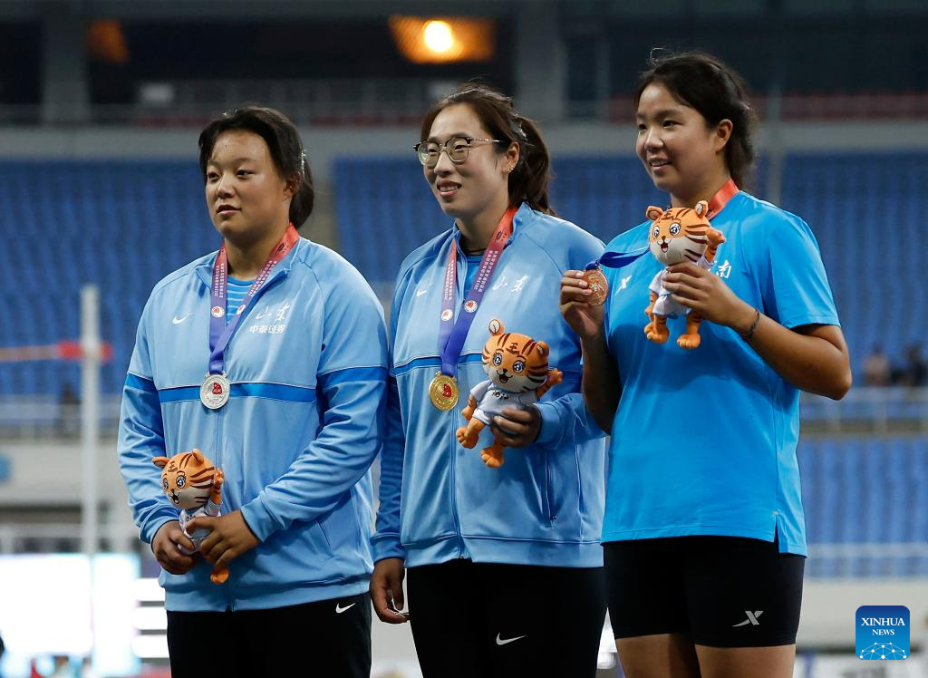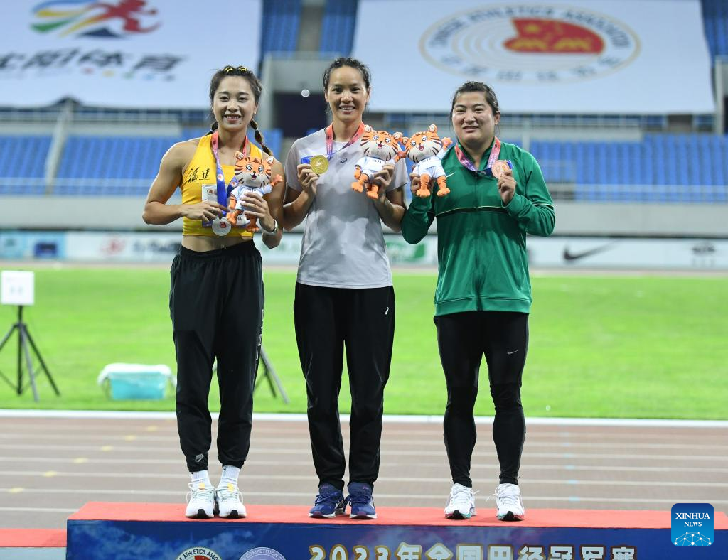 Gold medalist Feng Bin (C) of Shandong Zhongtai Securities reacts during the awarding ceremony of the women's discus throw final at the 2023 China's National Athletics Championships, a qualification trial for World Athletics Championships Budapest 23 and the Hangzhou Asian Games in Shenyang, northeast China's Liaoning Province, June 27, 2023. (Xinhua/Wang Lili)