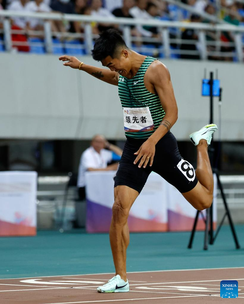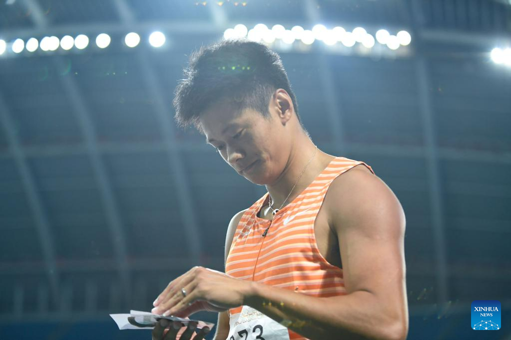 First-placed Xie Zhenye of Zhejiang reacts after the men's 100m final at the 2023 China's National Athletics Championships, a qualification trial for World Athletics Championships Budapest 23 and the Hangzhou Asian Games in Shenyang, northeast China's Liaoning Province, June 27, 2023. (Xinhua/Long Lei)