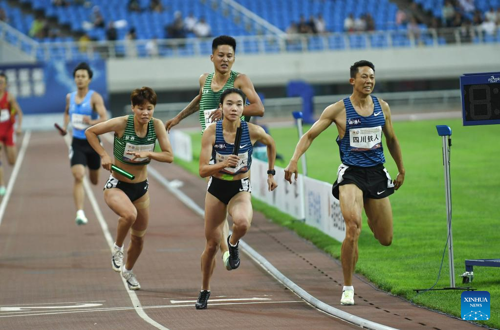Athletes compete during the mixed 4x400m final at the 2023 China's National Athletics Championships, a qualification trial for World Athletics Championships Budapest 23 and the Hangzhou Asian Games in Shenyang, northeast China's Liaoning Province, June 27, 2023. (Xinhua/Long Lei)