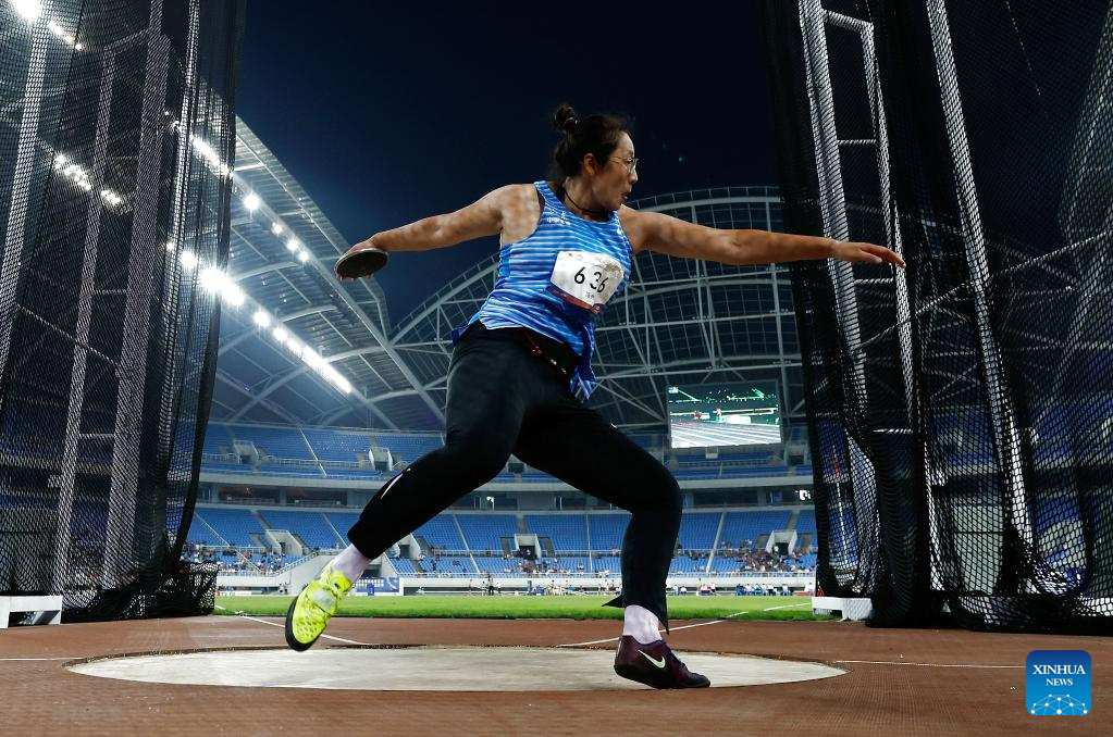 Feng Bin of Shandong Zhongtai Securities competes during the women's discus throw final at the 2023 China's National Athletics Championships, a qualification trial for World Athletics Championships Budapest 23 and the Hangzhou Asian Games in Shenyang, northeast China's Liaoning Province, June 27, 2023. (Xinhua/Wang Lili)