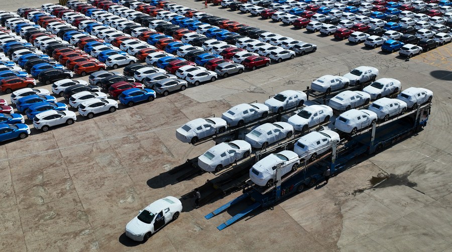 This aerial photo shows cars to be loaded for export at Lianyungang Port, east China's Jiangsu Province, May 9, 2023. (Xinhua/Geng Yuhe)