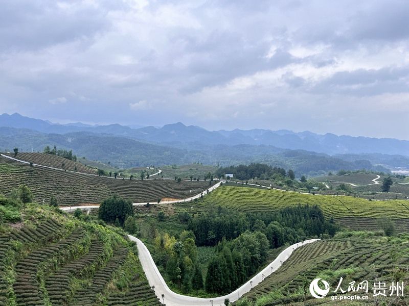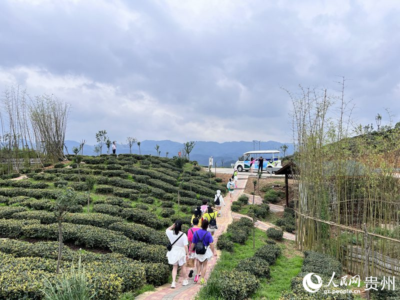Tourists sightsee at a tea garden on Fenghuang Mountain in Zhijin county, Bijie city, southwest China's Guizhou Province. (People's Daily Online/Chen Jiequan)