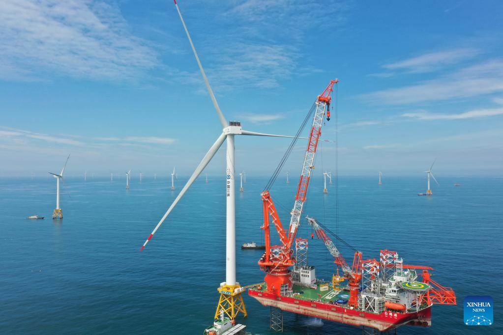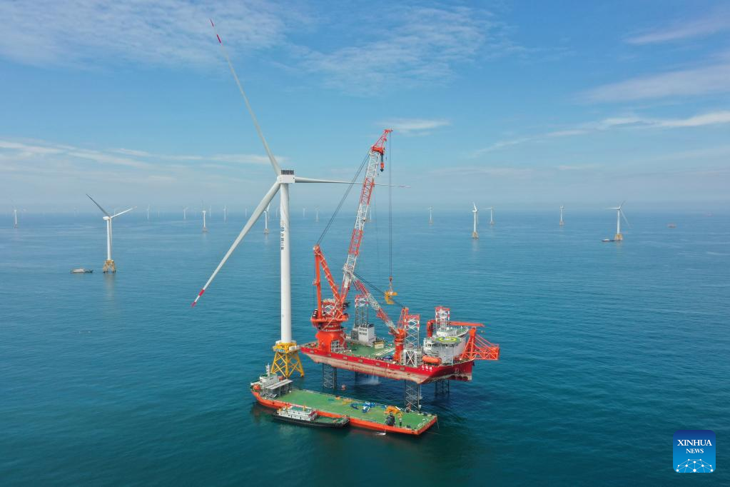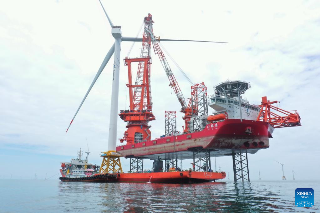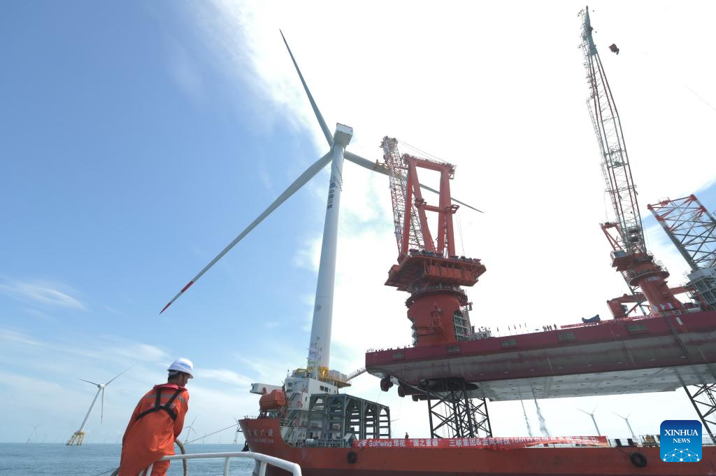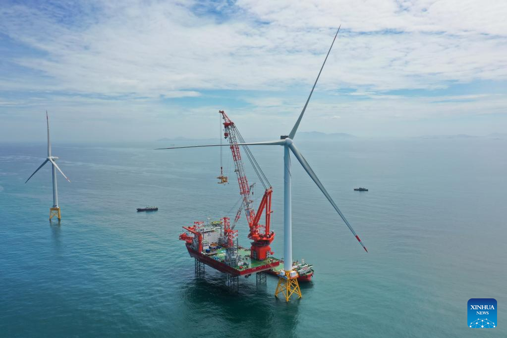 This photo shows the construction site of the world's first 16-megawatt offshore wind turbine in Fuzhou, southeast China's Fujian Province, June 28, 2023. The construction of the giant offshore wind turbine, with the world's largest per-unit capacity, was completed here on Wednesday, according to China Three Gorges Corporation. (Xinhua/Lin Shanchuan)