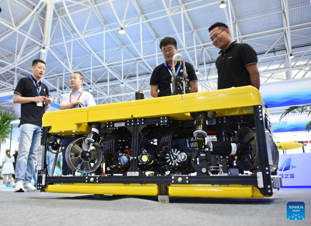 People view an underwater glider at the 2023 East Asia Marine Expo in Qingdao, east China's Shandong Province, June 28, 2023.