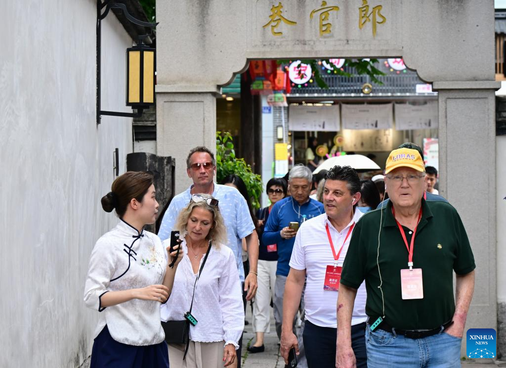 Guests visit Sanfangqixiang (Three Lanes and Seven Alleys), an ancient block in downtown Fuzhou, southeast China's Fujian Province, June 27, 2023.