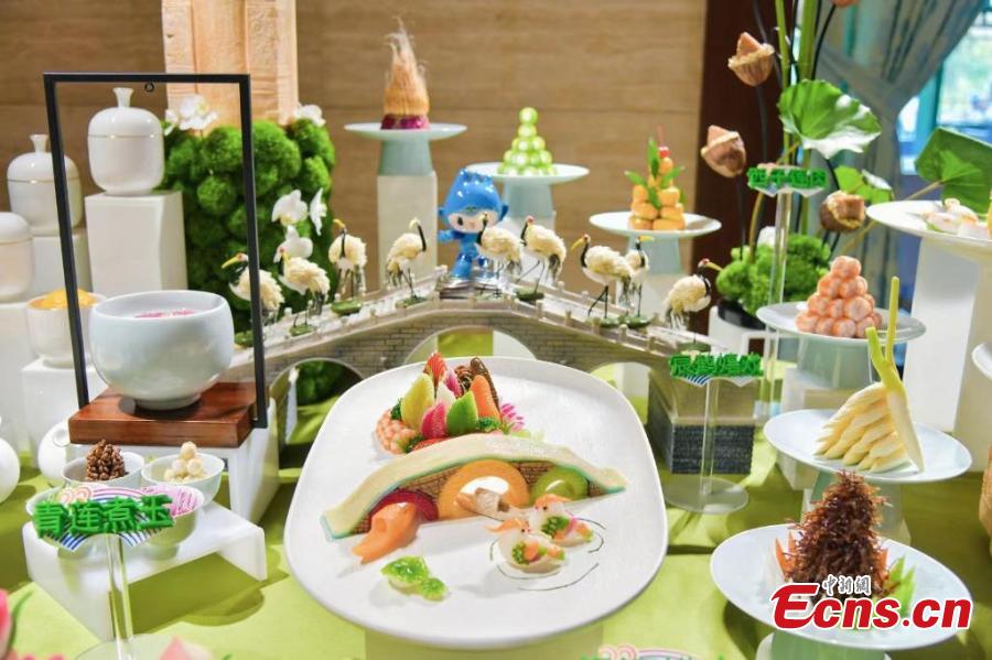 Dishes themed Hangzhou Asian Games are displayed at a cooking competition in Hangzhou, east China's Zhejiang Province, June 27, 2023. (Photo provided to China News Service)