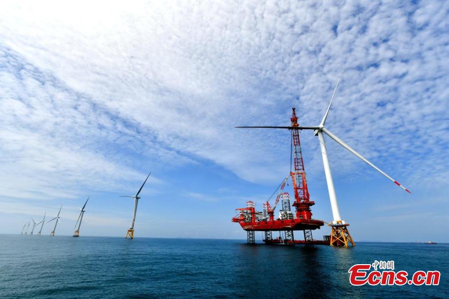 The world's first offshore wind turbine with an installed capacity of 16 megawatts is installed on Baihetan, an offshore platform with a lifting capacity of 2,000 tons, in Pingtan, east China's Fujian Province, June 28, 2023. (Photo: China News Service/Lv Ming)