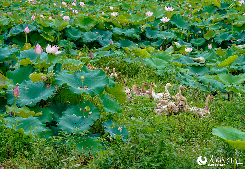 Ducks are seen in a lotus pond in Laozhu She township in Liandu district, Lishui city, east China's Zhejiang Province. (People's Daily Online/Zhang Yongtao)