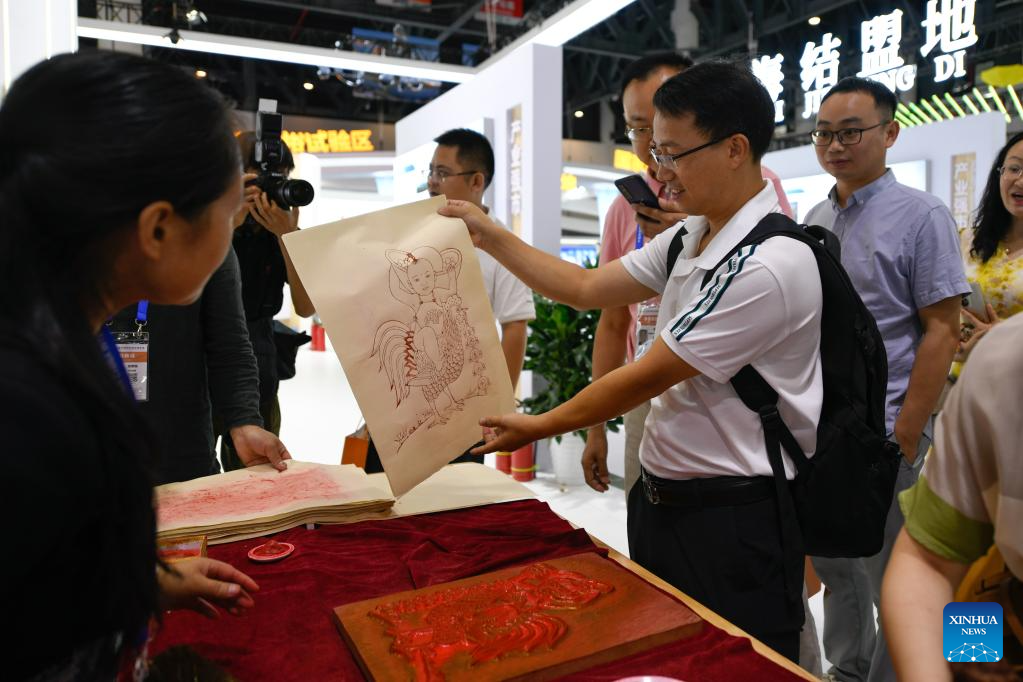 A visitor learns about Jiajiang new year painting at the Leshan exhibition area during the 19th Western China International Fair (WCIF) in Chengdu, southwest China's Sichuan Province, June 29, 2023. Kicking off here on Thursday, the five-day fair attracts more than 3,500 enterprises from 56 countries and regions. (Xinhua/Xu Bingjie)