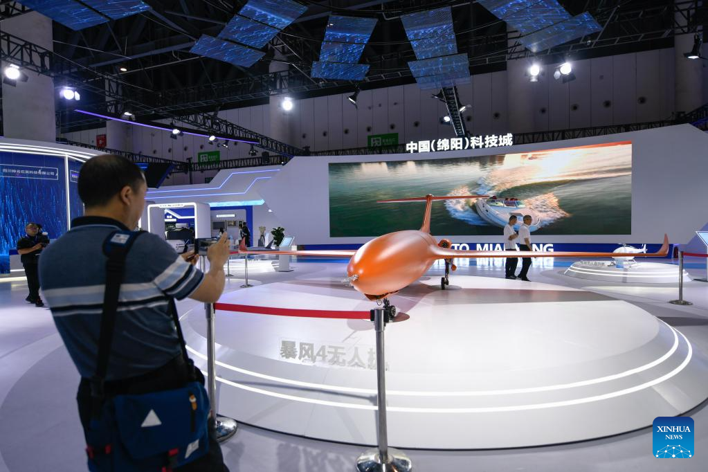 A visitor takes photos of a drone at the Mianyang exhibition area during the 19th Western China International Fair (WCIF) in Chengdu, southwest China's Sichuan Province, June 29, 2023. Kicking off here on Thursday, the five-day fair attracts more than 3,500 enterprises from 56 countries and regions. (Xinhua/Xu Bingjie)