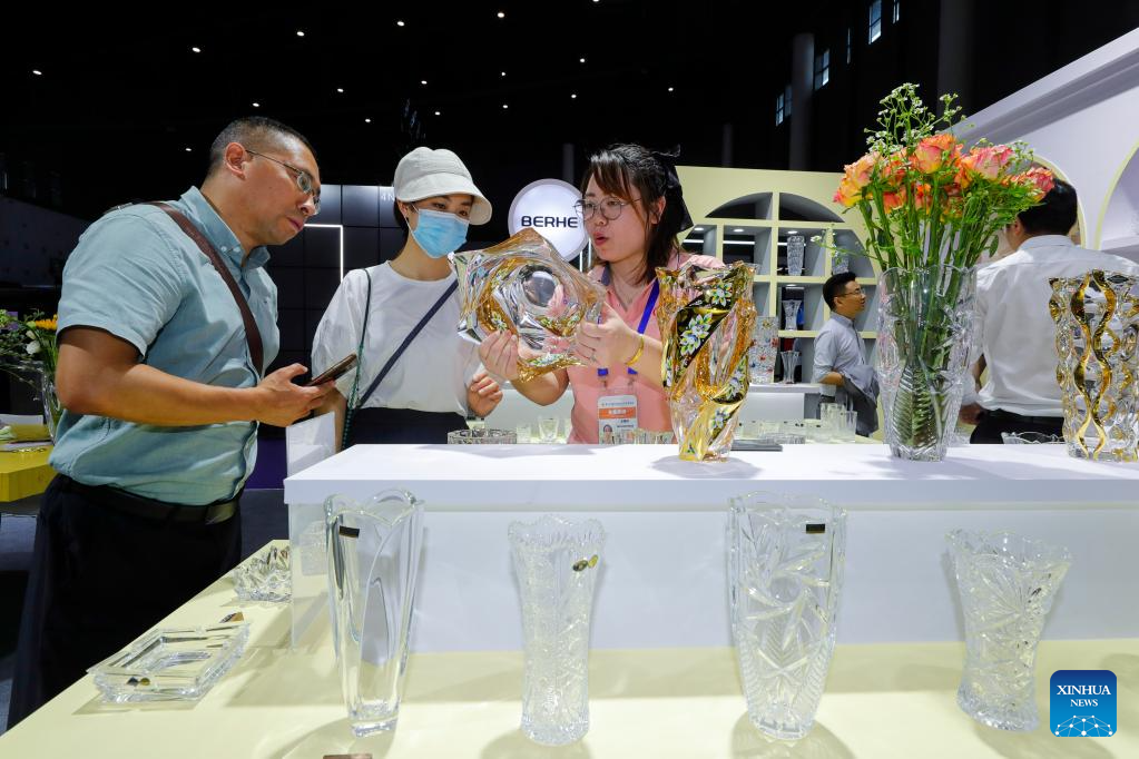 Visitors look at crystal artifacts at the Czech pavilion of the Belt and Road International Cooperation Pavilion during the 19th Western China International Fair (WCIF) in Chengdu, southwest China's Sichuan Province, June 29, 2023. Kicking off here on Thursday, the five-day fair attracts more than 3,500 enterprises from 56 countries and regions. (Xinhua/Shen Bohan)