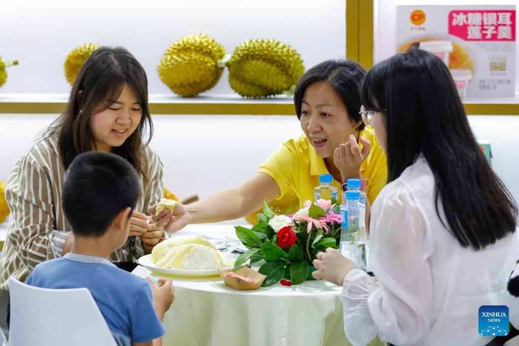 Visitors taste durian at the exhibition booth of CP Group in the Belt and Road International Cooperation Pavilion during the 19th Western China International Fair (WCIF) in Chengdu, southwest China's Sichuan Province, June 29, 2023. Kicking off here on Thursday, the five-day fair attracts more than 3,500 enterprises from 56 countries and regions. (Xinhua/Shen Bohan)