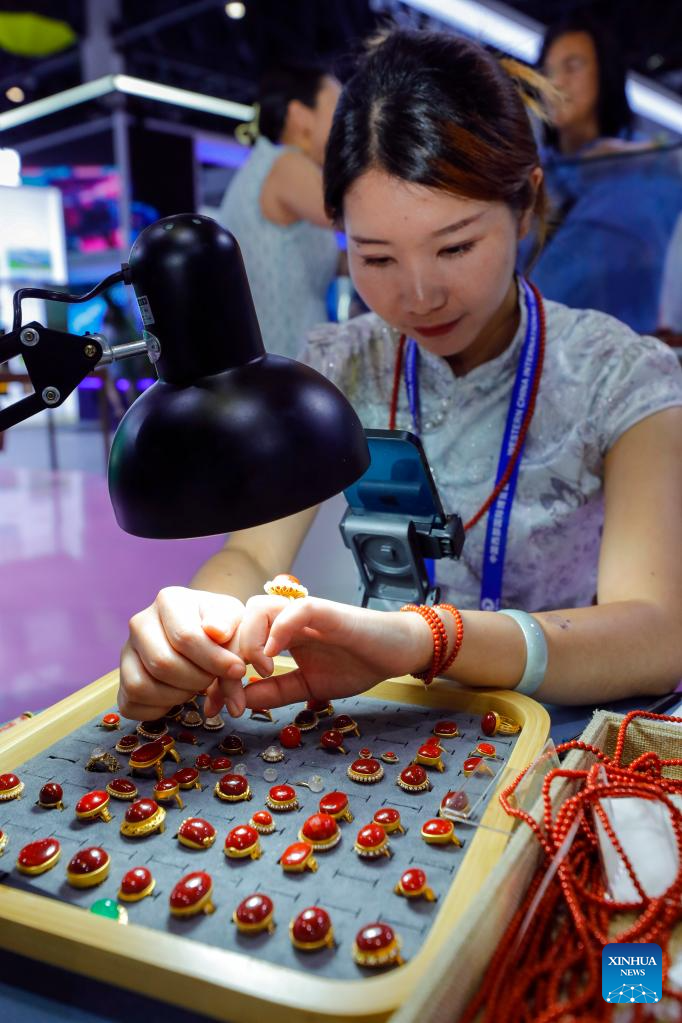 A staff member sells red agate jewelry via livestreaming at the exhibition area of Liangshan Yi Autonomous Prefecture of the Sichuan Collaborative Development Pavilion during the 19th Western China International Fair (WCIF) in Chengdu, southwest China's Sichuan Province, June 29, 2023. Kicking off here on Thursday, the five-day fair attracts more than 3,500 enterprises from 56 countries and regions. (Xinhua/Shen Bohan)