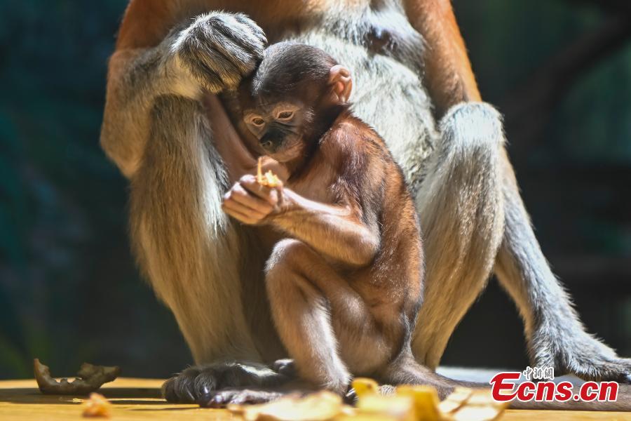 Wu Yi, a long-nosed (proboscis monkey) monkey baby meets the public at Chimelong Safari Park in Guangzhou, south China's Guangdong Province, June 29, 2023. (Photo: China News Service/Chen Jimin)