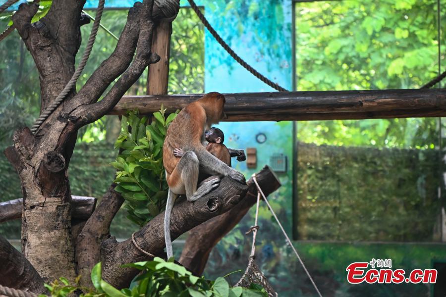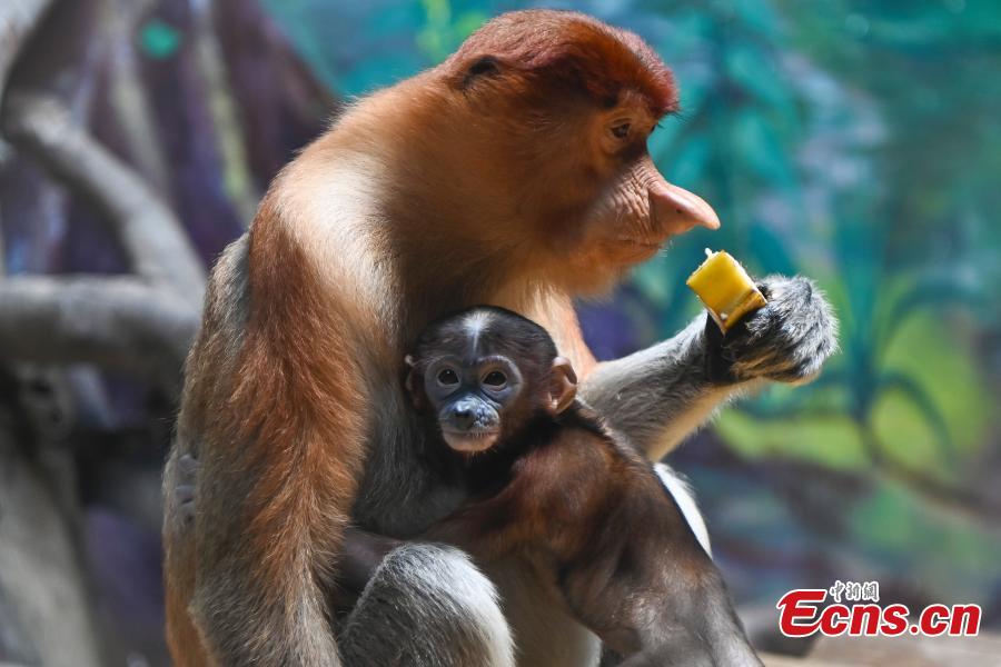 Wu Yi, a long-nosed (proboscis monkey) monkey baby meets the public with its mother Pety at Chimelong Safari Park in Guangzhou, south China's Guangdong Province, June 29, 2023. (Photo: China News Service/Chen Jimin)