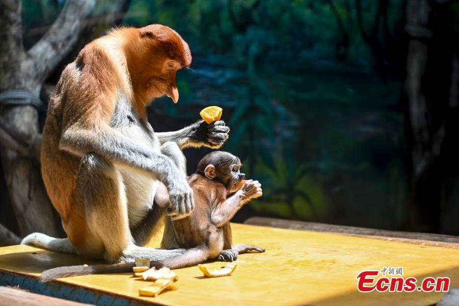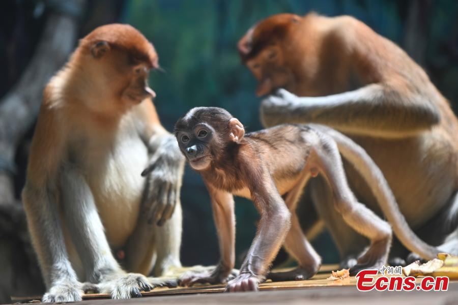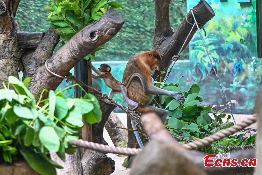 Wu Yi, a long-nosed (proboscis monkey) monkey baby meets the public with family members at Chimelong Safari Park in Guangzhou, south China's Guangdong Province, June 29, 2023. (Photo: China News Service/Chen Jimin)
