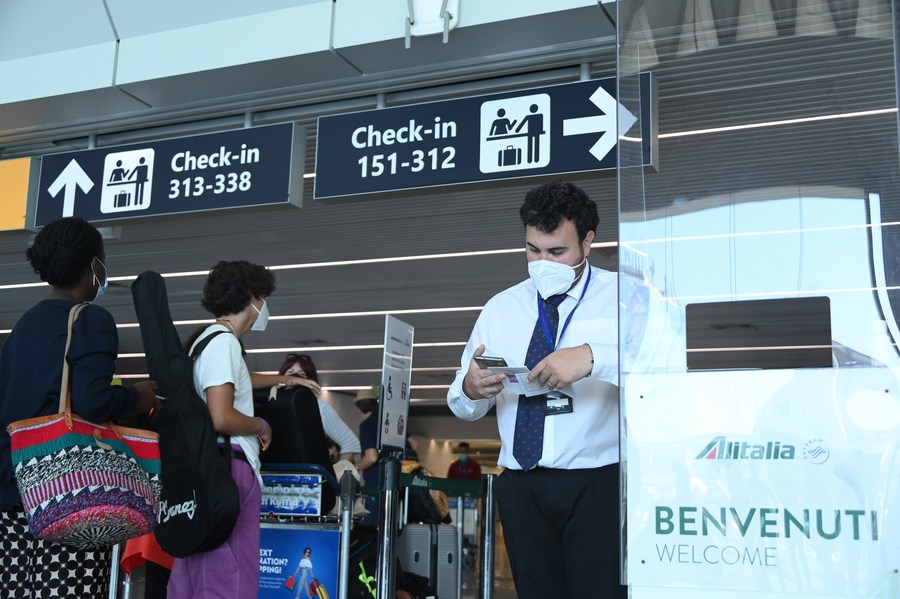 A staff member checks the COVID-19 green pass of a passenger at Fiumicino airport in Rome, Italy, on Sept. 1, 2021. (Photo by Alberto Lingria/Xinhua)