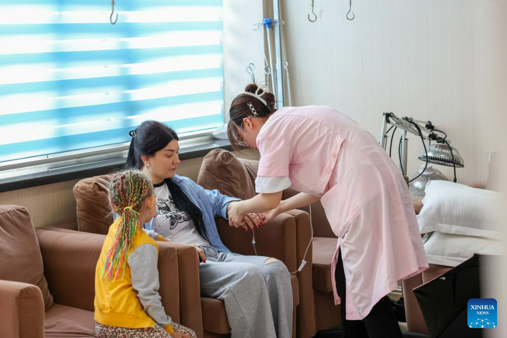 A nurse gives an intravenous infusion treatment to a Russian patient at a hospital in Hunchun, northeast China's Jilin Province, June 28, 2023. Hunchun is located at China's border with Russia and the Democratic People's Republic of Korea. Traditional Chinese medicine treatments such as acupuncture and Tuina remedial massage have drawn Russian tourists to the city. (Xinhua/Yan Linyun)
