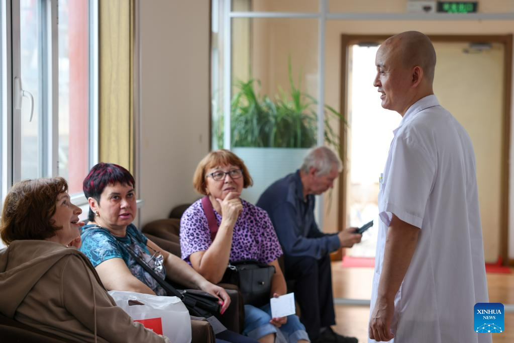 A doctor talks with patients at a hospital in Hunchun, northeast China's Jilin Province, June 28, 2023. Hunchun is located at China's border with Russia and the Democratic People's Republic of Korea. Traditional Chinese medicine treatments such as acupuncture and Tuina remedial massage have drawn Russian tourists to the city. (Xinhua/Yan Linyun)