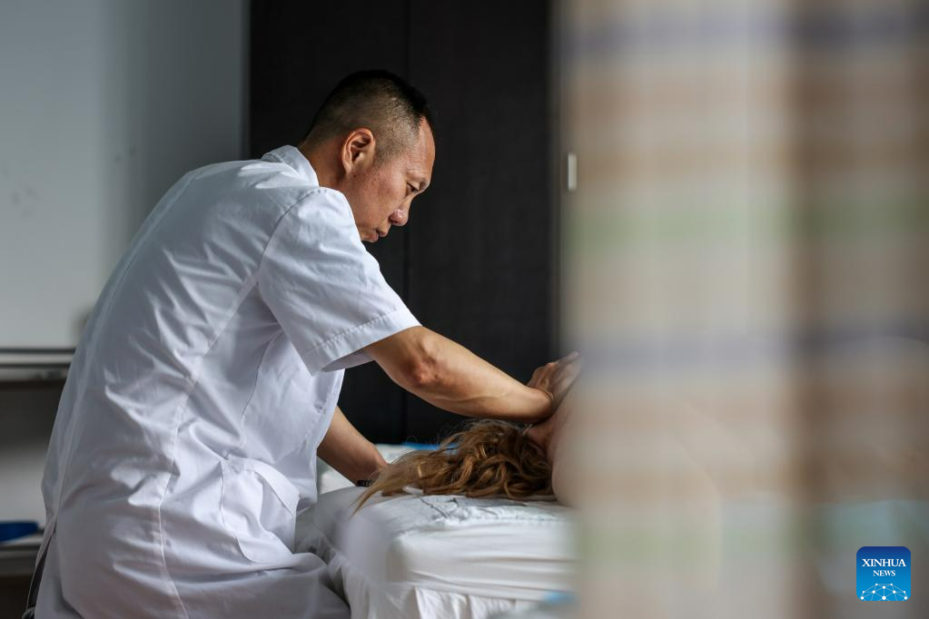 A doctor performs a traditional Chinese medicine therapy on a Russian patient at a hospital in Hunchun, northeast China's Jilin Province, June 28, 2023. Hunchun is located at China's border with Russia and the Democratic People's Republic of Korea. Traditional Chinese medicine treatments such as acupuncture and Tuina remedial massage have drawn Russian tourists to the city. (Xinhua/Yan Linyun)