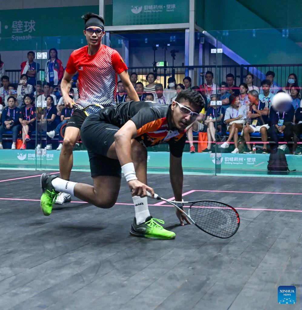Yuen Chee Wern (L) and Abhay Singh compete during the semifinal match between Rachel Mae Arnold/Yuen Chee Wern of Malaysia and Anahat Singh/Abhay Singh of India at the "Exciting Hangzhou" Asian Squash Mixed Doubles Tournament 2023 in Hangzhou, east China's Zhejiang province, June 29, 2023. (Xinhua/Sun Fanyue)