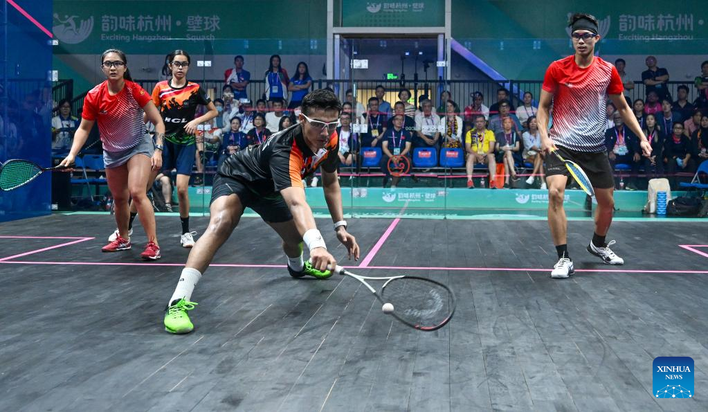 Anahat Singh (2nd L)/Abhay Singh (2nd R) of India compete during the semifinal match against Rachel Mae Arnold (1st L)/Yuen Chee Wern of Malaysia at the "Exciting Hangzhou" Asian Squash Mixed Doubles Tournament 2023 in Hangzhou, east China's Zhejiang province, June 29, 2023. (Xinhua/Sun Fanyue)