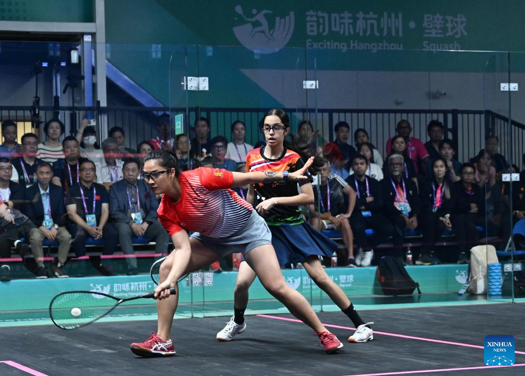 Rachel Mae Arnold (L) and Anahat Singh compete during the semifinal match between Rachel Mae Arnold/Yuen Chee Wern of Malaysia and Anahat Singh/Abhay Singh of India at the "Exciting Hangzhou" Asian Squash Mixed Doubles Tournament 2023 in Hangzhou, east China's Zhejiang province, June 29, 2023. (Xinhua/Sun Fanyue)