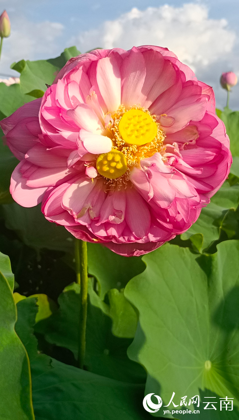 A wild pink lotus flower with two carpellary receptacles recently photographed at the Puzhehei scenic spot in Qiubei county, Wenshan Zhuang and Miao Autonomous Prefecture, southwest China's Yunnan Province. (Photo/Zhang Wendong)
