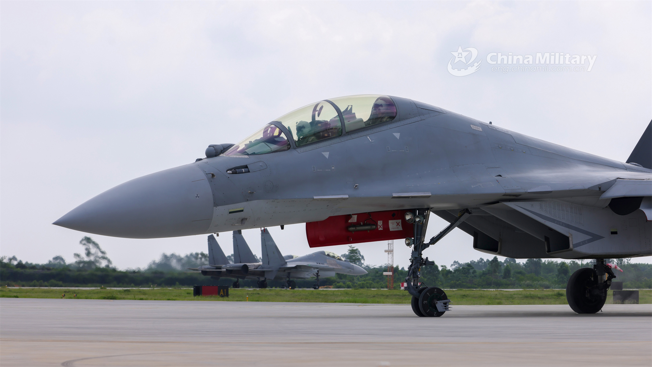 A fighter jet attached to an aviation brigade of the air force under the PLA Southern Theatre Command taxis on the runway during a round-the-clock flight training exercise in late June, 2023. (eng.chinamil.com.cn/Photo by Hao Hunan)
