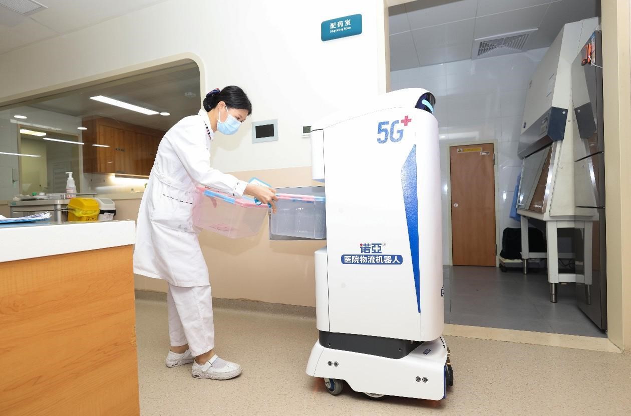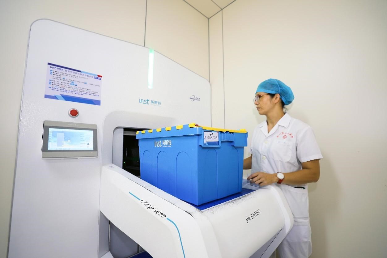 A nurse of the inpatient department of the Liuzhou Worker's Hospital, south China's Guangxi Zhuang autonomous region, takes out medicines from a logistics robot. (Photo/Chen Xinyuan)