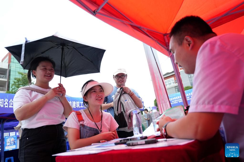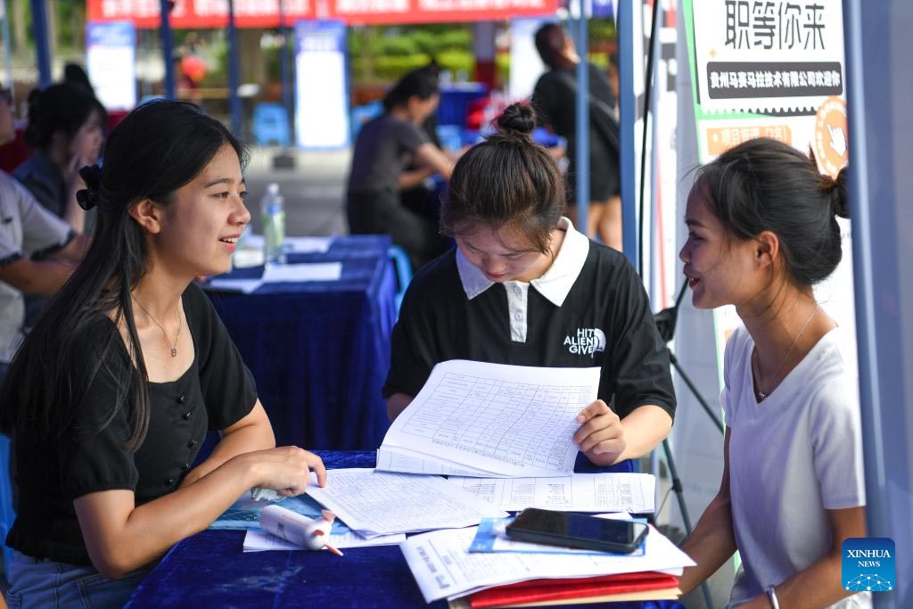 A college graduate (R) inquires about job opportunities at a job fair in Qiandongnan Miao and Dong Autonomous Prefecture, southwest China's Guizhou Province, June 30, 2023. The event attracted 122 employers based in Guian New Area in Guizhou Province, the Guangdong-Hong Kong-Macao Greater Bay Area and other regions, providing nearly 4,000 job opportunities to college graduates. (Xinhua/Yang Wenbin)