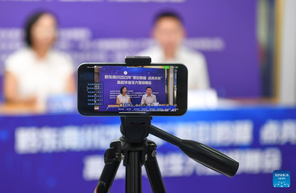 This photo taken on June 30, 2023 shows the online section of a job fair in Qiandongnan Miao and Dong Autonomous Prefecture, southwest China's Guizhou Province. The event attracted 122 employers based in Guian New Area in Guizhou Province, the Guangdong-Hong Kong-Macao Greater Bay Area and other regions, providing nearly 4,000 job opportunities to college graduates. (Xinhua/Yang Wenbin)