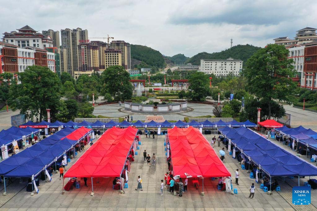 This aerial photo taken on June 30, 2023 shows a job fair in Qiandongnan Miao and Dong Autonomous Prefecture, southwest China's Guizhou Province. The event attracted 122 employers based in Guian New Area in Guizhou Province, the Guangdong-Hong Kong-Macao Greater Bay Area and other regions, providing nearly 4,000 job opportunities to college graduates. (Xinhua/Yang Wenbin)