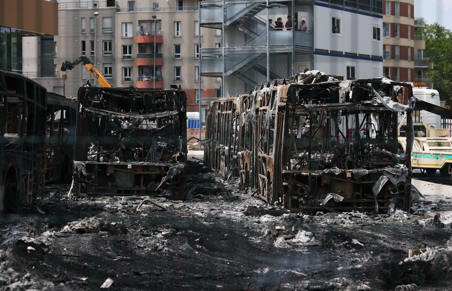 Burnt buses are seen at the Fort d'Aubervilliers bus terminal, in Aubervilliers, north of Paris, France, June 30, 2023. (Xinhua/Gao Jing)