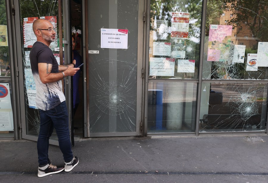 A library attacked by protesters is seen in Aubervilliers, north of Paris, France, June 30, 2023. (Xinhua/Gao Jing)