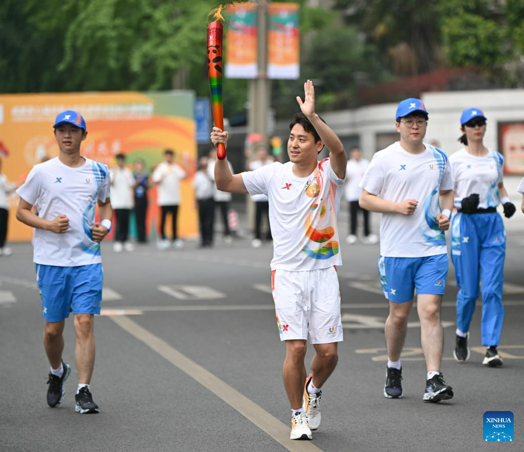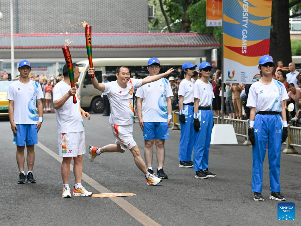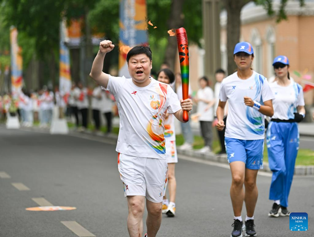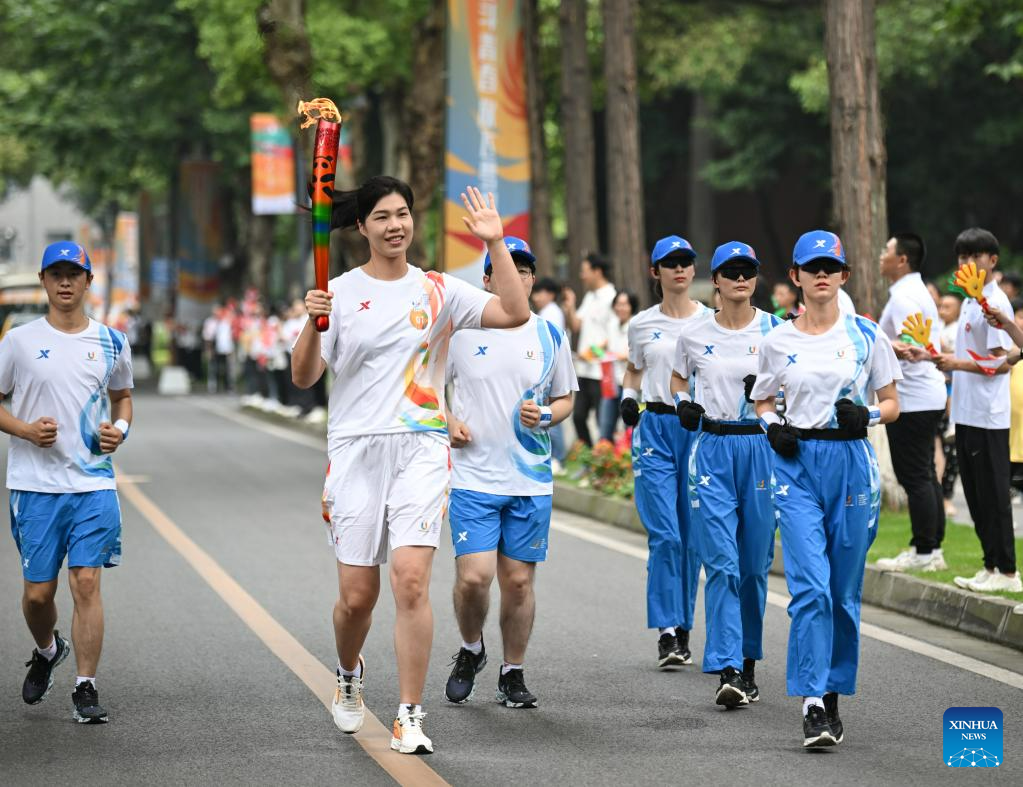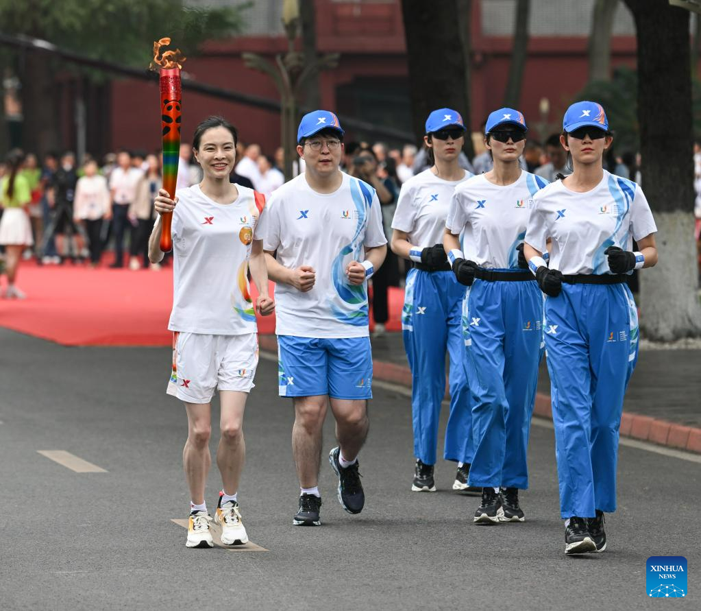 Torch bearer Yao Xia runs with the torch during the torch relay of the Chengdu 2021 FISU Summer World University Games at the Sichuan University in Chengdu, southwest China's Sichuan Province, July 2, 2023. (Xinhua/Wang Xi)