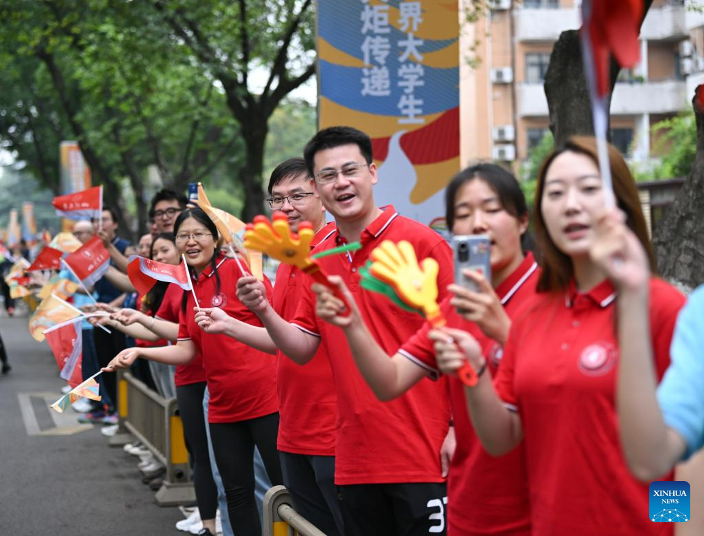 Teachers and students of Sichuan University cheer for the torch bearers during the torch relay of the Chengdu 2021 FISU Summer World University Games at the Sichuan University in Chengdu, southwest China's Sichuan Province, July 2, 2023. (Xinhua/Wang Xi)