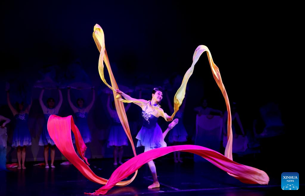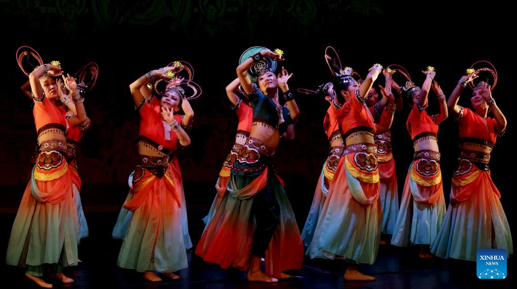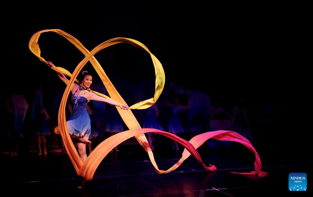 Artists perform during the Silk Road Dance Festival in London, Britain, July 1, 2023. A Chinese dance show was held in east London on Saturday evening, offering the local audience a sensory cultural feast. (Xinhua/Li Ying)