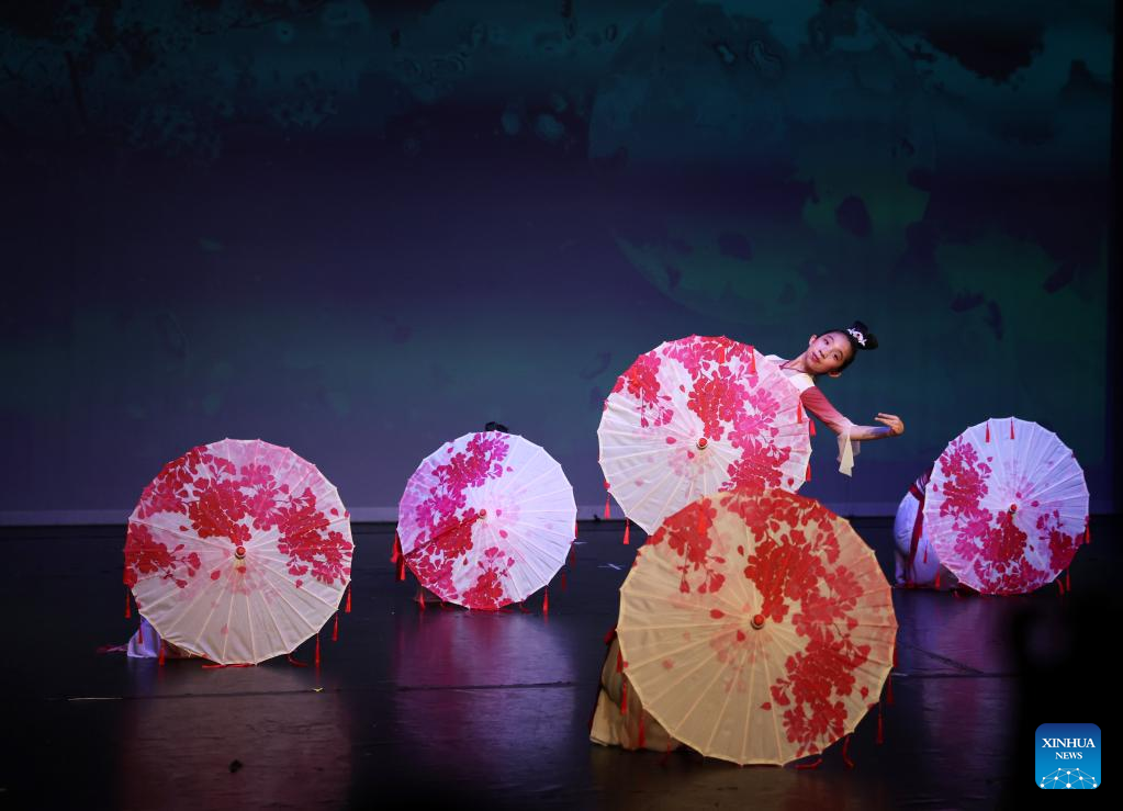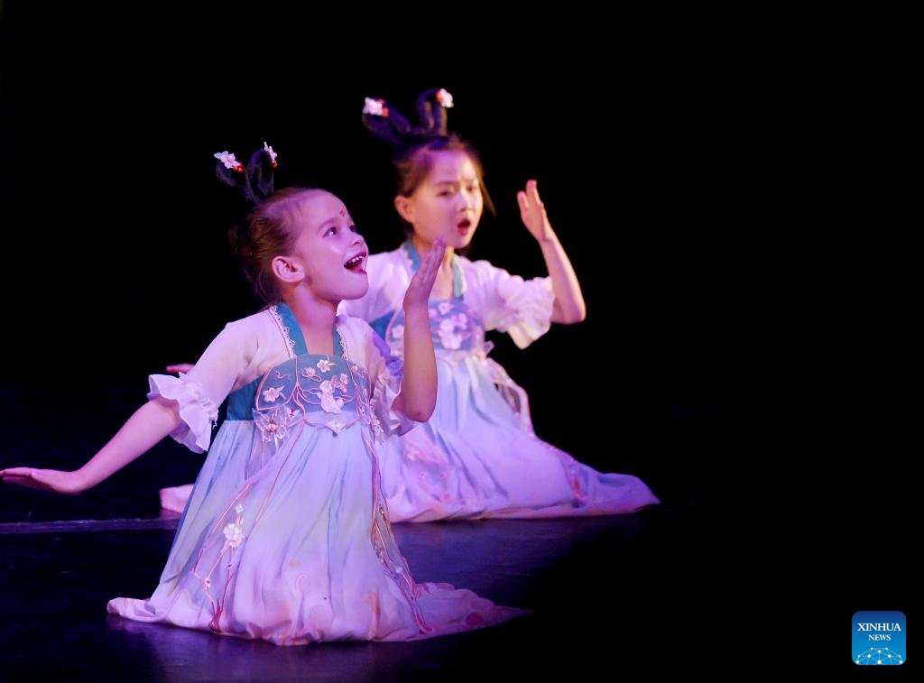 Children perform during the Silk Road Dance Festival in London, Britain, July 1, 2023. A Chinese dance show was held in east London on Saturday evening, offering the local audience a sensory cultural feast.?(Xinhua/Li Ying)