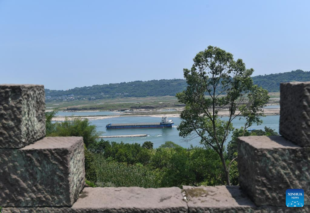 A cargo ship sails past the Shenbi ancient battlefield site in Hejiang County of Luzhou City, southwest China's Sichuan Province, June 27, 2023. The ancient battlefield site was first built in 1243 during the Southern Song Dynasty (1127-1279). It was listed as one of the seventh batch of national key cultural relics protection units in 2013. (Xinhua/Liu Kun)