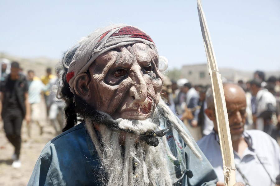 A local troupe member wearing the mask of a monster celebrates the Eid al-Adha festival at Al-Maazbah village in Ibb Province, Yemen, on July 1, 2023. (Photo by Mohammed Mohammed/Xinhua)