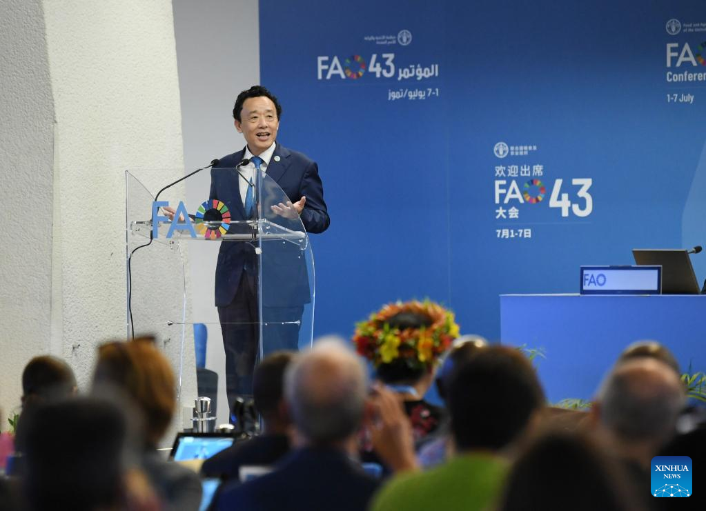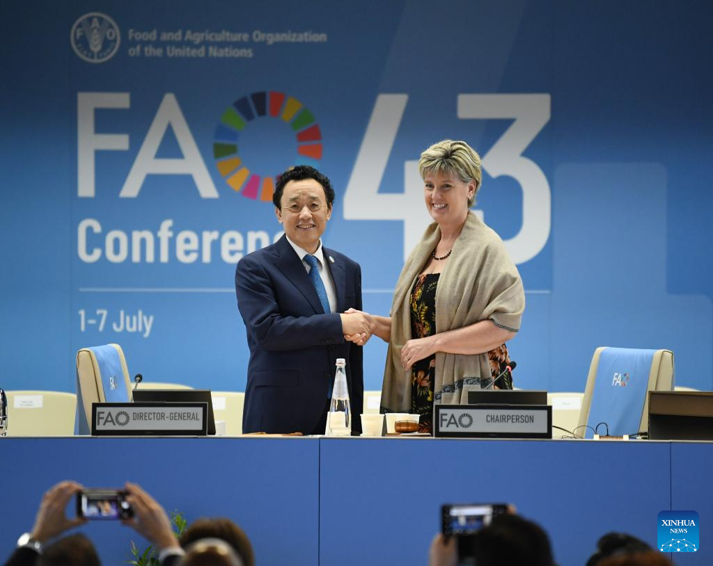 ROME, July 2 (Xinhua) -- Qu Dongyu was re-elected as director-general of the United Nations Food and Agriculture Organization (FAO) here on Sunday during the ongoing 43rd session of the FAO Conference.