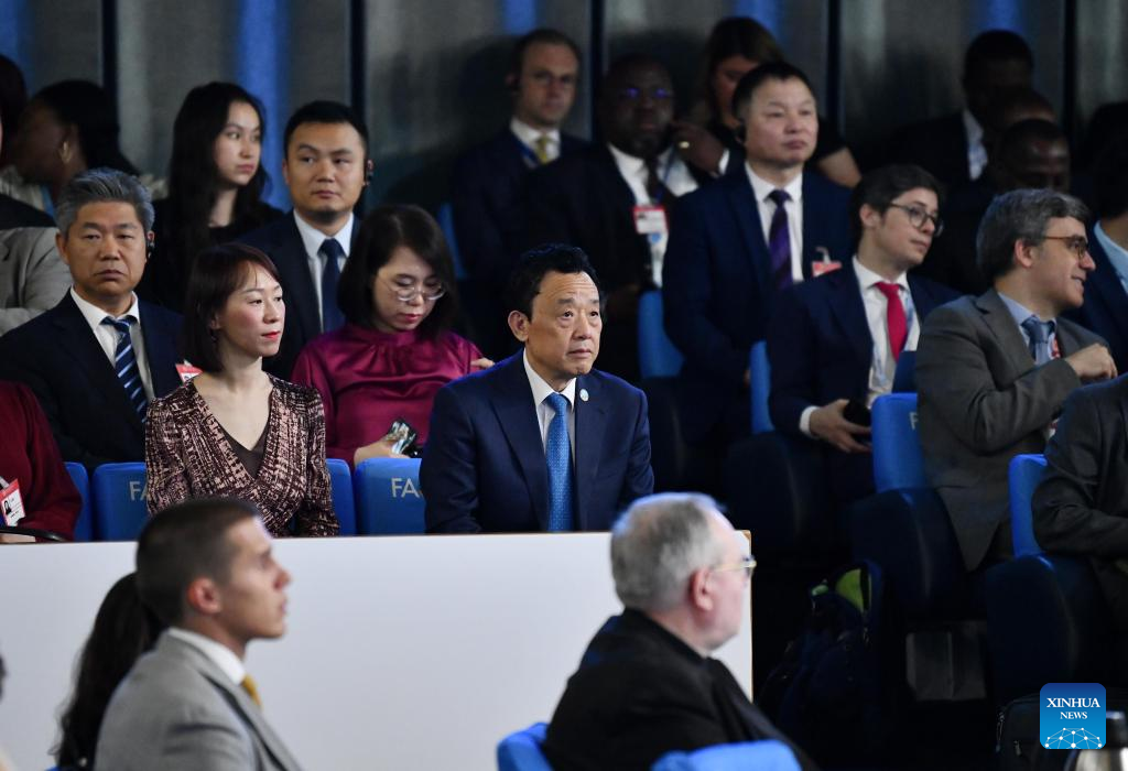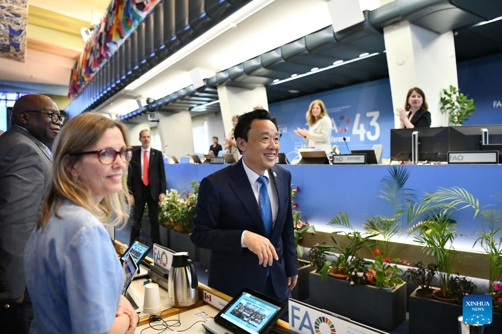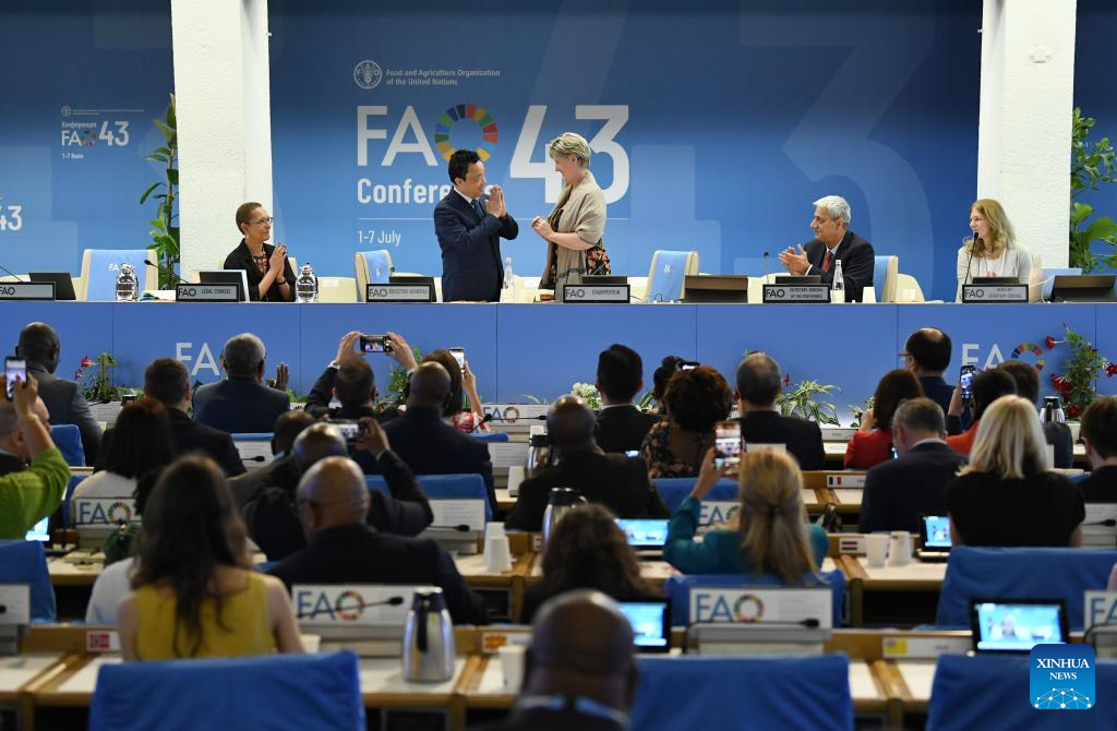 United Nations Food and Agriculture Organization (FAO) Director-General Qu Dongyu (C) attends the 43rd session of the FAO Conference in Rome, Italy, July 2, 2023. Qu Dongyu was re-elected as director-general of the FAO here on Sunday. (Xinhua/Jin Mamengni)