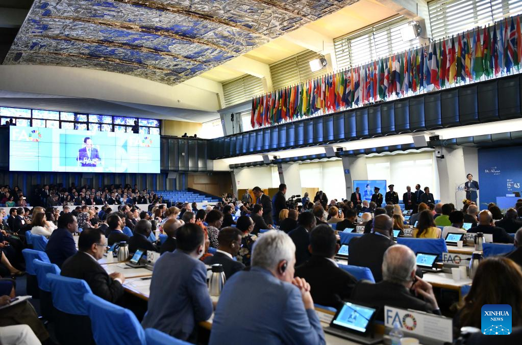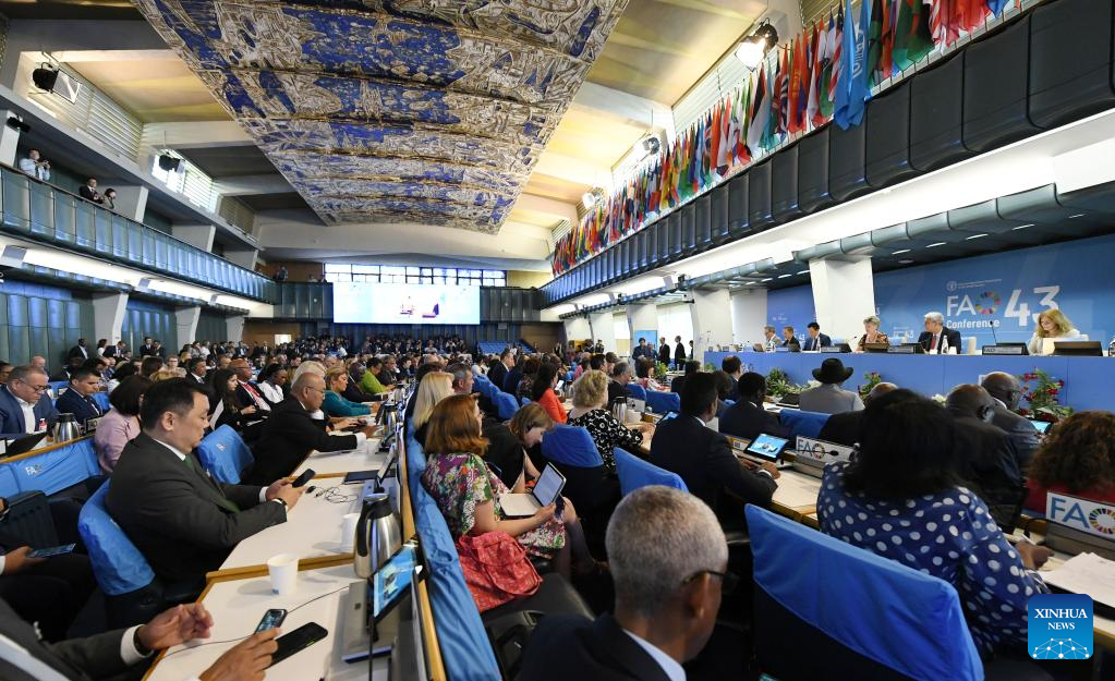 This photo taken on July 2, 2023 shows a scene at the 43rd session of the United Nations Food and Agriculture Organization (FAO) Conference in Rome, Italy. Qu Dongyu was re-elected as director-general of the FAO here on Sunday. (Xinhua/Jin Mamengni)