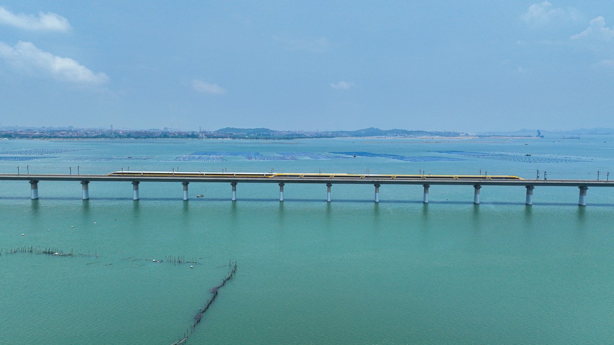 On Wednesday, test trains traveled at a speed of 453 km/h on the Meizhou Bay Bridge from opposite directions, passing each other.