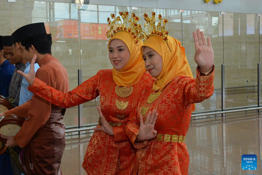 Performers organized by Brunei tourism authority welcome Chinese tourists at Brunei International Airport in Bandar Seri Begawan, capital of Brunei, July 1, 2023. (Photo by Jeffrey Wong/Xinhua)