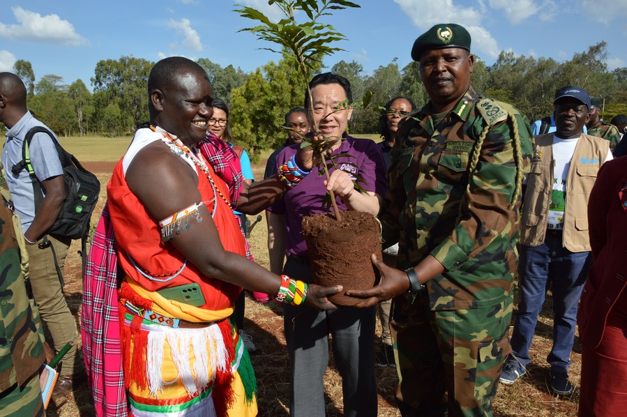 Food and Agriculture Organization of the United Nations (FAO) Director-General Qu Dongyu (C, Front) prepares to plant a medicinal seedling during a tour of Karura forest on the outskirts of Nairobi, Kenya, on Feb. 19, 2023. (Photo by Charles Onyango/Xinhua)