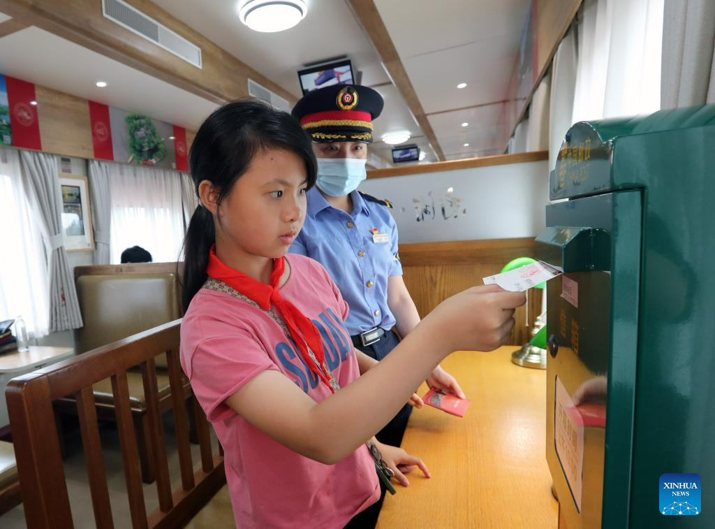 A young passenger sends a postcard on the train No. Y701 running between east China's Shanghai and Jiaxing of east China's Zhejiang Province, June 30, 2023. On June 25, 2021, on the occasion of the centenary of the founding of the Communist Party of China, the No. Y701 "Nanhu·1921" tourism train from Shanghai to Jiaxing was launched for the first time, connecting the tourism resources of Shanghai and Jiaxing which related to the founding and revolutionary history of the Party. The train now runs a round trip once a day between Shanghai West Railway Station and Jiaxing Railway Station. (Xinhua/Liu Ying)