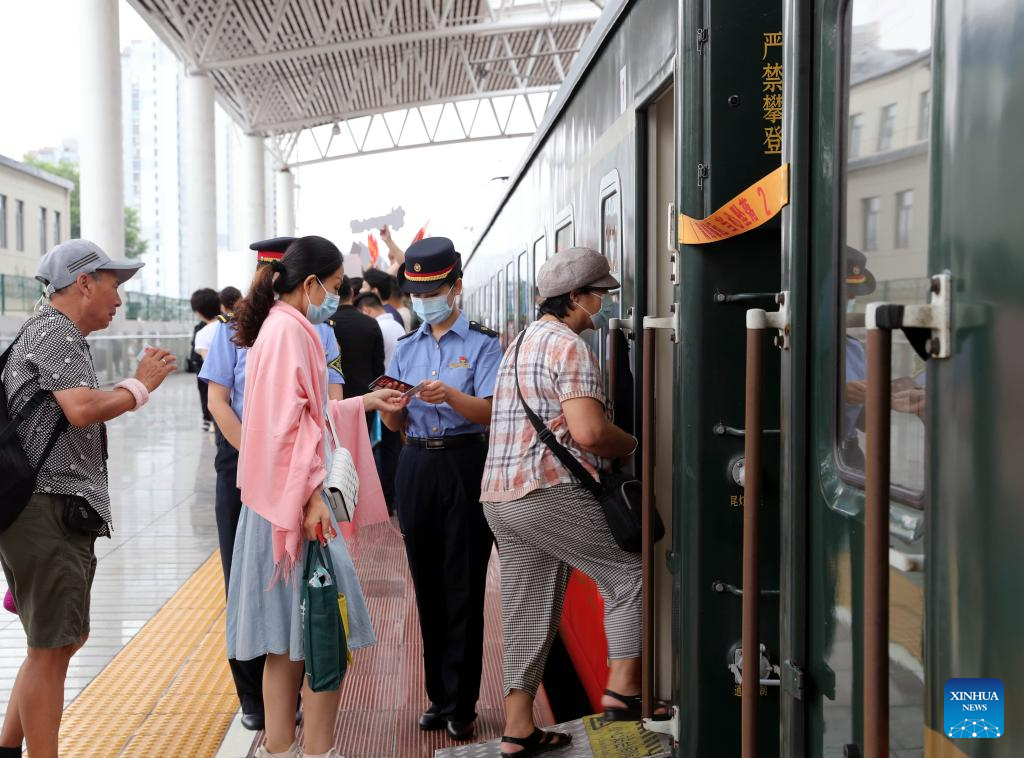 Passengers board the train No. Y701 running between east China's Shanghai and Jiaxing of east China's Zhejiang Province, June 30, 2023. On June 25, 2021, on the occasion of the centenary of the founding of the Communist Party of China, the No. Y701 "Nanhu·1921" tourism train from Shanghai to Jiaxing was launched for the first time, connecting the tourism resources of Shanghai and Jiaxing which related to the founding and revolutionary history of the Party. The train now runs a round trip once a day between Shanghai West Railway Station and Jiaxing Railway Station. (Xinhua/Wang Xiang)